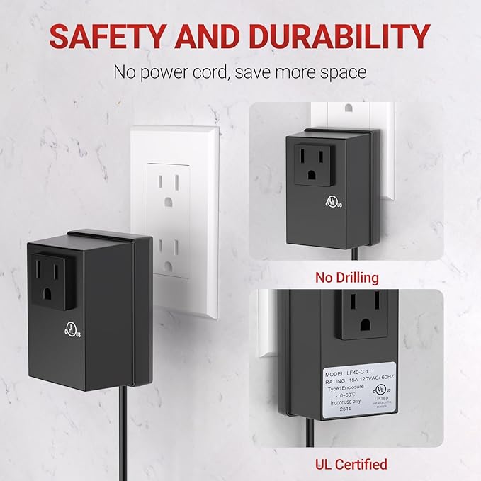 - Easy Installation: Plugs into an outlet and works without the need for installation tools. You can also drill your own holes if there are not pre-drilled.