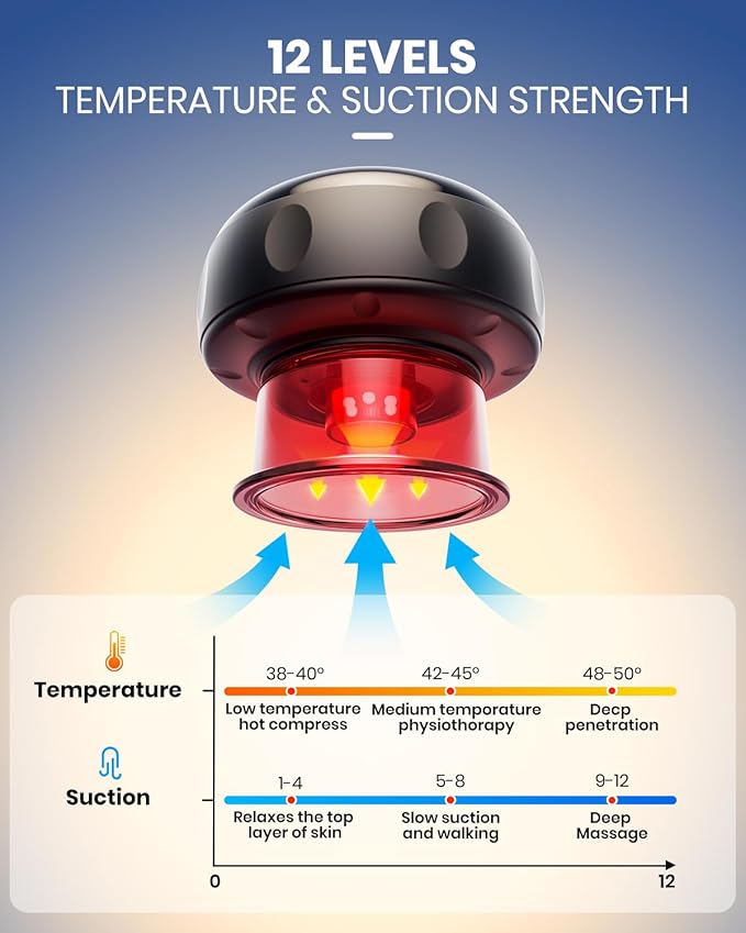 - [Therapy That Adapts to You] This cupping therapy set features 12 levels of suction and 12 levels of heat, plus deep and soothing modes. Whether you need gentle care or deep muscle stimulation, it delivers tailored relief across body areas. Tip: Start at level 1 if you're new.