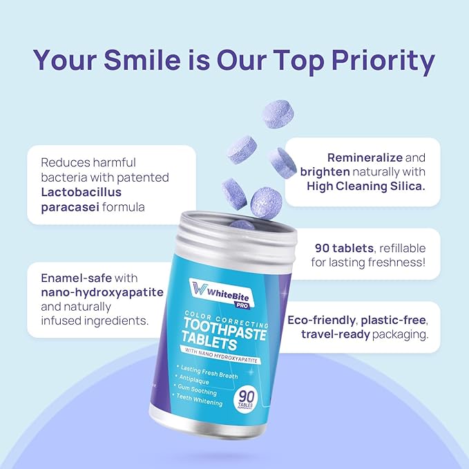 Whitebite Pro Color Correcting Toothpaste Tablets with Nano Hydroxyapatite | Fresh Breath & Natural Whitening | Travel-Friendly Toothpaste & Mouthwash | Fluoride and Plastic-Free (Peppermint)