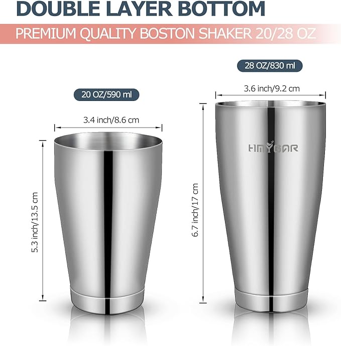 - Included Components : 20/28OZ Boston Shaker, Double-Side Jigger (30ml/60ml), Mixing Spoon (25cm Length), Hawthorne Strainer, Fine Mesh Strainer, Liquid Pourer with Cap, Muddler, Corkscrew, Bottle Stopper, Ice Tong, Zester, Lemon Squeezer, Stainless Straw, Cocktail Pick, Cocktail Stirrer, Brush for Cleaning Straw/Pourer, Storage Glass, 39-Recipe Cocktail Cards, Bamboo Stand. 20/28OZ Boston Shaker, Double-Side Jigger (30ml/60ml), Mixing Spoon (25cm Length), Hawthorne Strainer, Fine Mesh Strainer, Liquid… See more