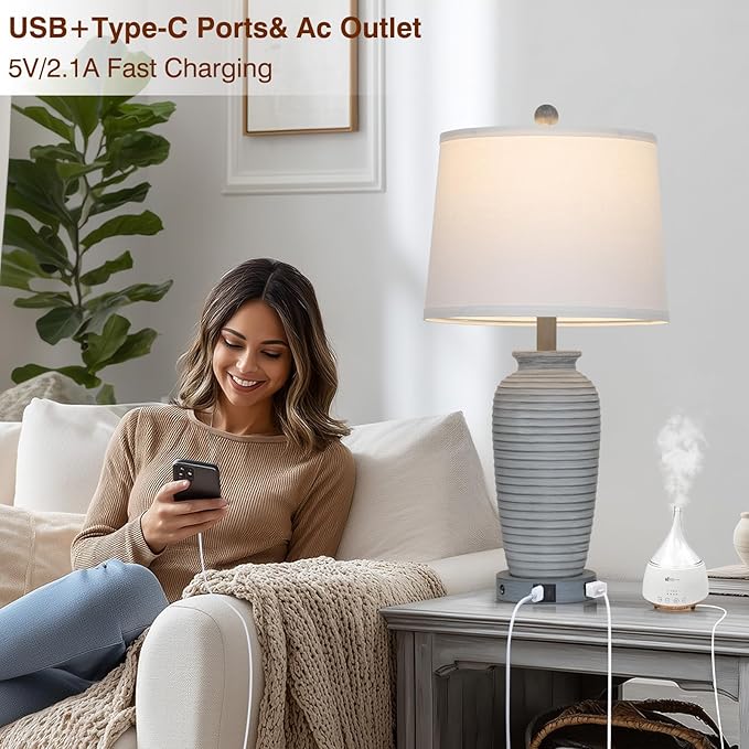 - USB A+C Charging Ports and AC Outlet:Are you bothered by the lack of charging ports when want to charge? The Built in 5V/2.1A USB & TYPE-C Charging Ports and AC power outlet, allowing you to quickly charge 3 DEVICES at the same time, no worries about nowhere to charge your phones, tablets, speaker, etc. The charging function is available whether the rustic table lamp is on or off. Reduce the clutter of wall chargers or outlets while keeping your desk cleaner and tidier
