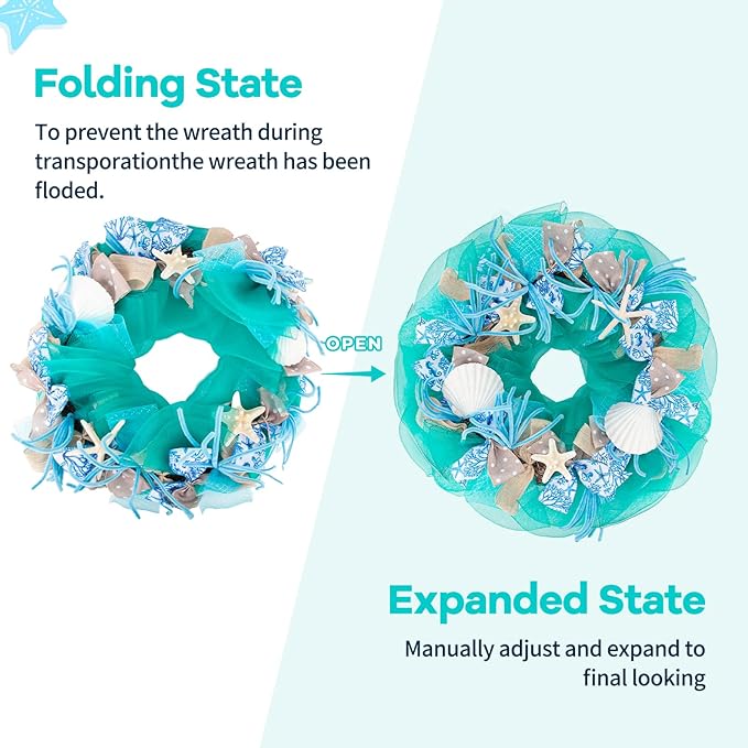 - 【Perfect for Any Space & Season】Whether hung on your front door, porch, living room wall, or used as a wedding or party backdrop, this wreath offers year-round beauty. Its durable construction and refreshing seaside colors make it suitable for spring, summer, and even beach-themed winter decor.