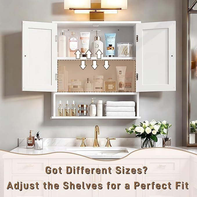 - Your Storage, Your Rules – Adjust Like a Pro! – Bathroom cabinet 2 adjustable shelves bend to your needs! Fit jumbo shampoo bottles, skincare stacks, or tall vases – no more awkward gaps. Bonus tip: Add bins for tiny items (razors, hairpins) – genius!