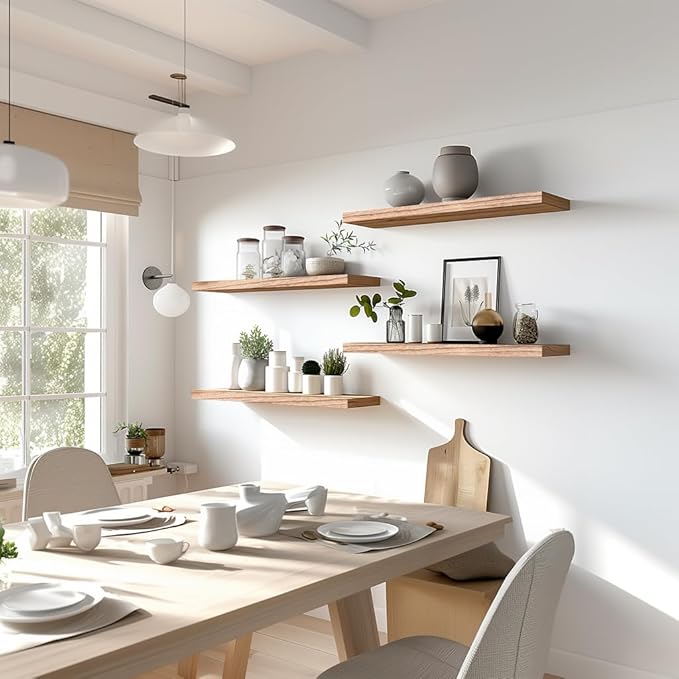- BEAUTIFUL FLOATING SHELVES - The style and finish of these floating shelves can match almost all themes in your home. Ideal home decor to organize bathroom, office, bedroom, living room, kitchen.