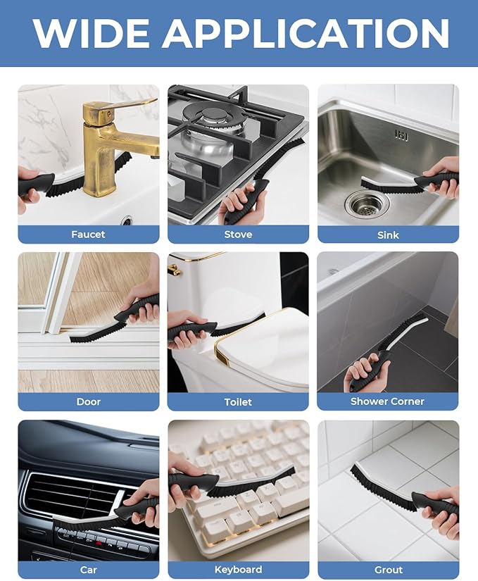 - Multi-purpose Brush: Our cleaning brushes are suitable for cleaning various surfaces such as sinks, window tracks, blinds, door tracks, faucets, cars, stoves, grout lines, basins, floors, keyboards, bathtubs, vents, drains, swimming pools, vehicles, furniture, boats, microwaves, coffee machines, shower door frames, fans, shoes, sneakers, ovens, washing machines, toilet tank floors, the seam between the toilet bottom and toilet lid, the gaps in carved furniture, outdoor brick seams, etc.