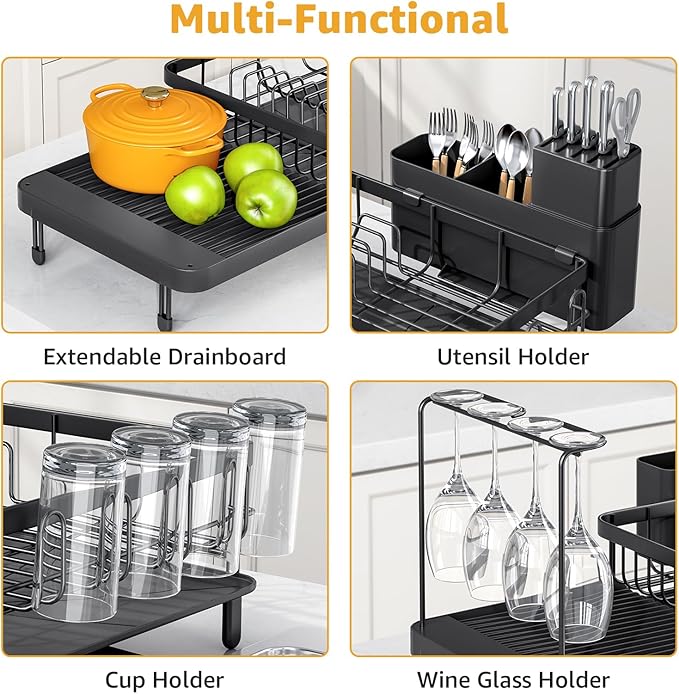 Dish Drying Rack for Kitchen Counter, Expandable Large Capacity Dish Rack with Drainboard, Wine Glasses Holder, Space Saving Organizer, Black