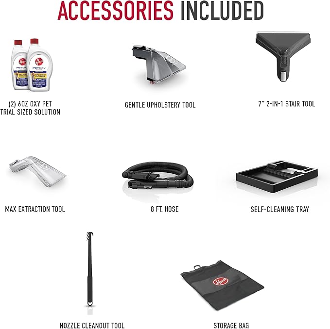 - WHAT’S INCLUDED: 7” 2-in-1 Stair Tool, Gentle Upholstery Tool, Max Extraction Tool, Nozzle Cleanout Tool, 8-foot hose, self-cleaning tray, (2) trial sized solutions and storage bag