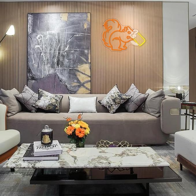 - Unique Design:Squirrel neon sign features an orange squirrel pouting its butt and holding a yellow white wine glass, which is very cute and playful. Squirrels drinking beer LED lights create a warm and relaxing lighting atmosphere in the bar.