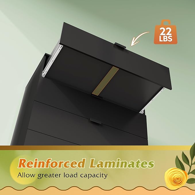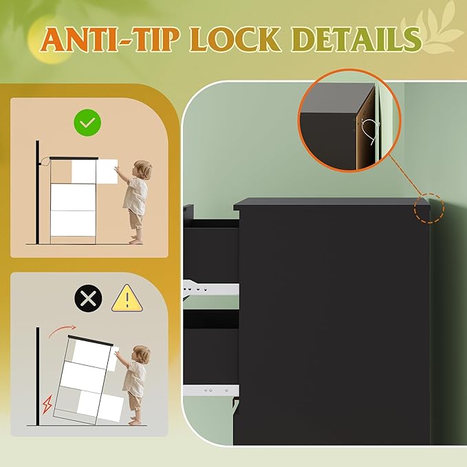 - 🏠【Safe and Sturdy】The bedroom dresser is crafted from durable engineered wood, ensuring long-term use and scratch resistance. Each wood drawer can hold up to 22lbs, and the wood tabletop can hold up to 88lbs. Equipped with an anti-tipping device, effectively preventing shaking or tipping over, keeping family members and pets safe.