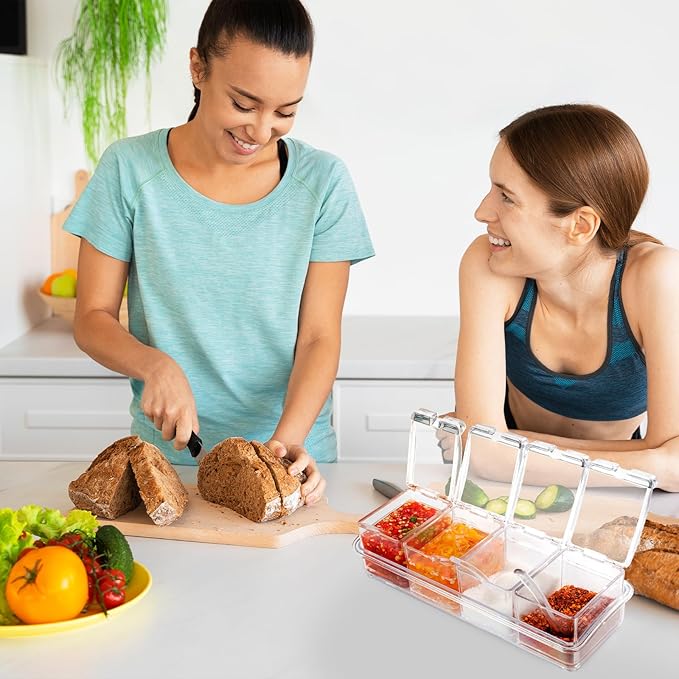- Smart 4-Compartment Design with Built-in Spoons: Each container features an integrated spoon slot to keep spoons clean and ready for quick scooping. Lids flip open instantly for one-handed use, and snug seals prevent cross-flavoring—perfect for organizing salt, pepper, cardamom, cinnamon, or baking powders.