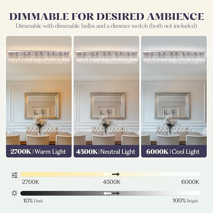 - RECTANGULAR FLUSH MOUNT CEILING LIGHT SIZE: L47" x W10" x H10" (120x25x25cm) for 161-215 square feet (15-20 square meters) space. Suitable for dining room, living room, bedroom, hallway, conference room, etc.(Recessed ceiling fixture, no hanging wires), luxury crystal chandelier modern enhances the overall beauty of any space