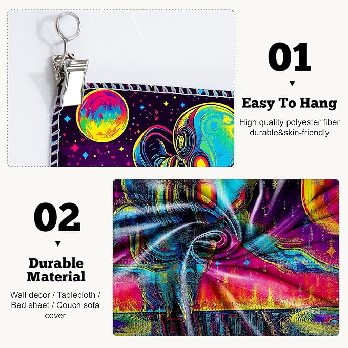 - Tapestry Material: This psychedelic tapestry is made of decent quality polyester fabric, soft touch and durable, fast drying and non-fading.