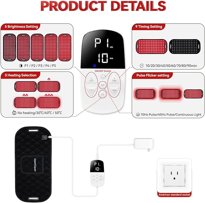 - 【MULTI-FUNCTION】:Our Red Light Therapy for body device is equipped with 3 pulse modes to optimize red light absorption, 5 adjustable brightness levels, 9 timing settings (from 0 to 90 minutes),and heating settings.Equipped with heating function, the heat promotes blood circulation and assists in red light therapy, greatly enhancing the efficacy of red light.The combination of these functions makes it suitable for use as a lumbar, shoulder, and back heating pad, as well as a knee joint pain relief.