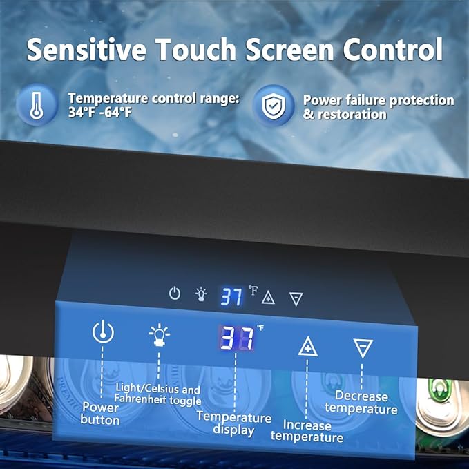- 【Precision Touch Screen Control】 This beverage refrigerator offers a range of 34°F to 64°F, with LED screen touch screen operation, precise control down to 1°F, and easily switch between Fahrenheit and Celsius to keep your beverages in optimal condition. The mini fridge has no vibration, and noise < 36dB, creating a quiet and comfortable environment for you. With temperature memory function, no need to reset after a power failure and reboot, power consumption is <0.5 kWh/24h, and the cost is <0.1/day