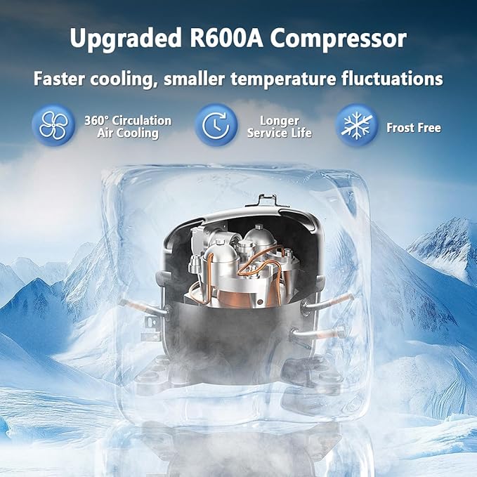 - 【Powerful and Quiet Compressor】 Utilizes an upgraded compressor, faster cooling, Temperature stability to ±1°F, 30% increase in life expectancy, and more stability and durability. 360° circulating air cooling system for frost-free cooling, Consistent and constant temperatures at every angle of the interior. The mini refrigerator's body insulation layer adopts microcellular high-pressure one-piece foaming technology for better heat insulation and heat preservation. Built-in LED blue light makes it easy to choose the drink you want at night