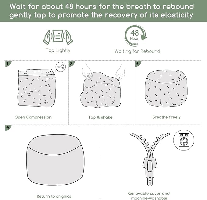 - For convenience and ease of use, this pouf ottoman comes pre-filled with memory foam chunk pouf filler, which can be easily inserted through the large round opening on the bottom with double zippers.