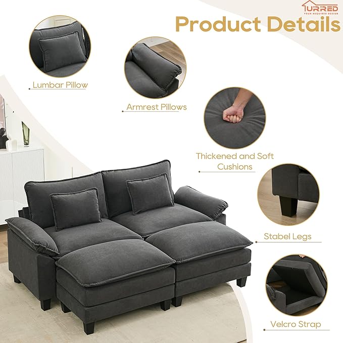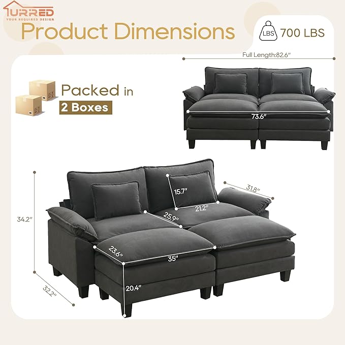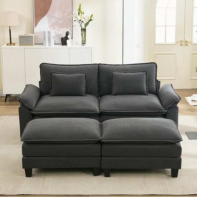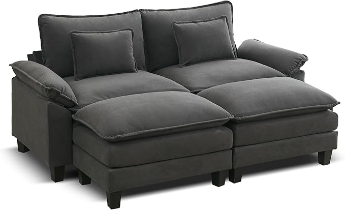 URRED Modular Sectional Sofa Comfy Cloud Couch, Modern Velvet Sofa Sleeper Deep Seat Couches with Ottoman/Pillows for Living Room (Dark Gray, 82.6''- 2 Ottomans)