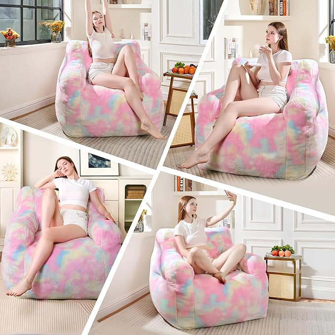 Recaceik Large Plush Bean Bag Chairs, Memory Foam Bean Bag Chair for Adults & Kids with Armrests, Comfy BeanBag Lounge Lazy Floor Sofa Accent Chair for Living Room, Bedroom, Dorm, Colorful Rainbow