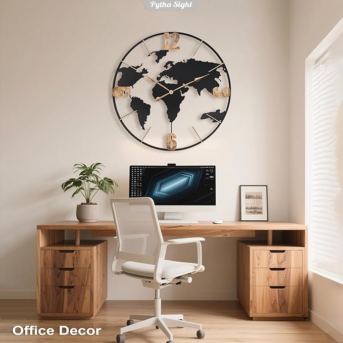 - 【Artistic World Map Design Concept】Pytha Sight 36inch large decorative world map wall clock combines the continent structure with a hollow design, outlining the continents with a stylish, minimalist artistic concept. It perfectly showcases the beauty of minimalist art. Not only does it have educational value, but it also displays an exquisite and elegant artistic effect.
