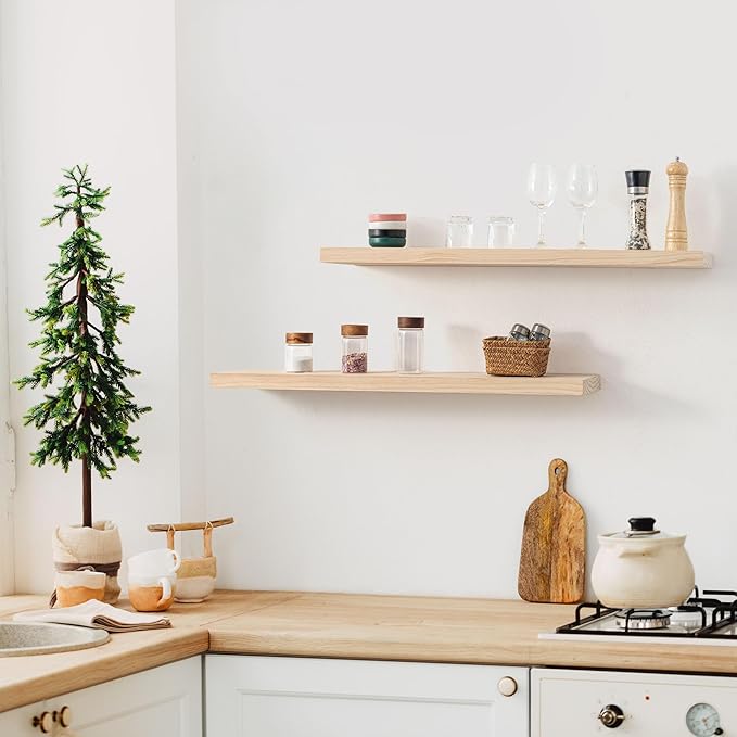- Extra Deeper & Thicker for Storage - Each board measures 36"W x 8"D x 1.4"H. Extra deeper and thicker design in order to bring maximizes storage space and weight capacity, even hold up to 60 lb. This floating shelf taking up zero square feet, reduces clutter and highlights décor in compact spaces. It can help make full use of the empty wall, making it much more space-saving and making your room look larger and tidier.
