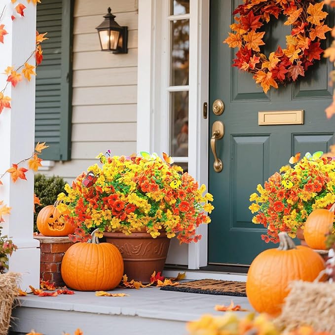 - Package Contents: This set includes 20 bundles of outdoor artificial flowers and 6 vivid faux butterflies(randomly color). Each fake outdoor plant features 7 flexible stems adorned with eucalyptus leaves and chrysanthemum blooms. Pot not included. (Yellow 10, Orange 10)