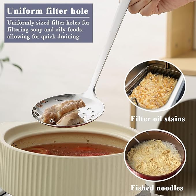 - 5. Hassle-Free Cleaning & Storage:Dishwasher-safe for quick cleanup, these utensils’ polished surfaces resist stains and odors. Their hanging holes enable easy storage on hooks or racks, keeping your kitchen organized and clutter-free.