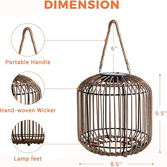 - HANDWOVEN DESIGN: Crafted with handwoven natural/black wicker in elegant openwork patterns, this outdoor lantern features a removable jute rope handle for versatile tabletop/ground/ hanging display. The intricate weave blending retro charm with warm glow for romantic decor