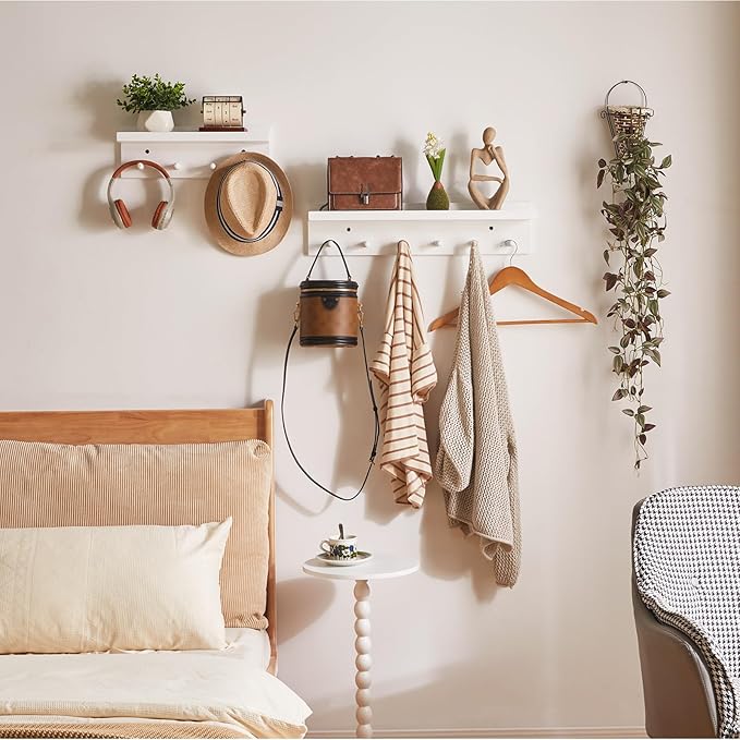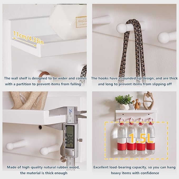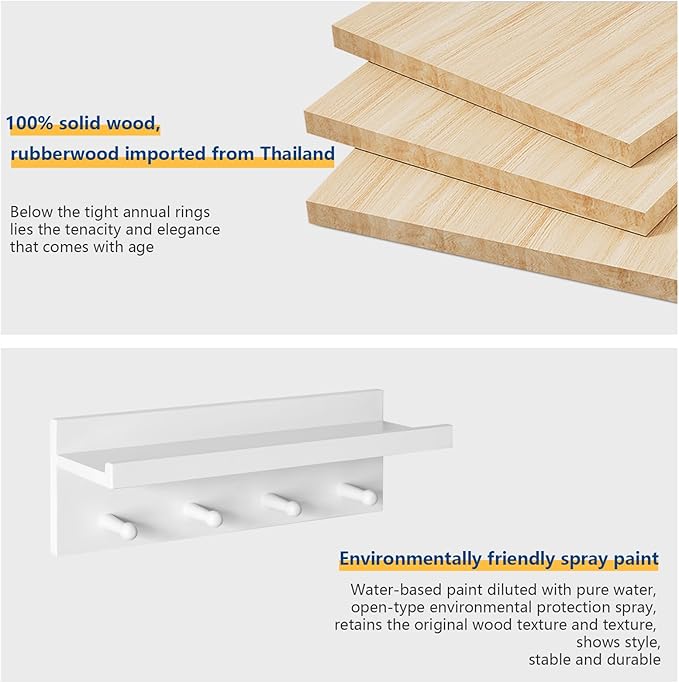 - Premium Solid Wood Construction:Crafted from 100% natural solid wood with smooth eco-friendly coating, this wall hook shelf resists warping and moisture damage. Built to hold up to 11.02lbs for coats, towels, or kitchenware