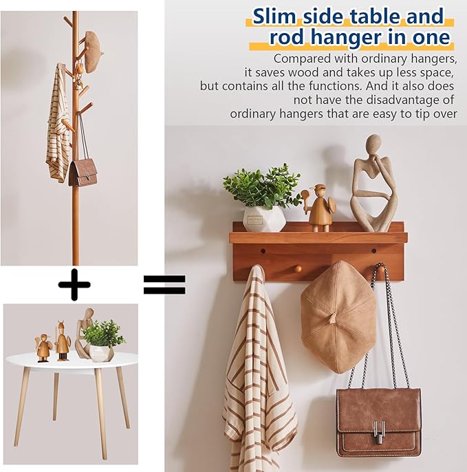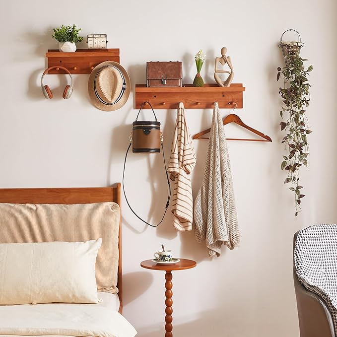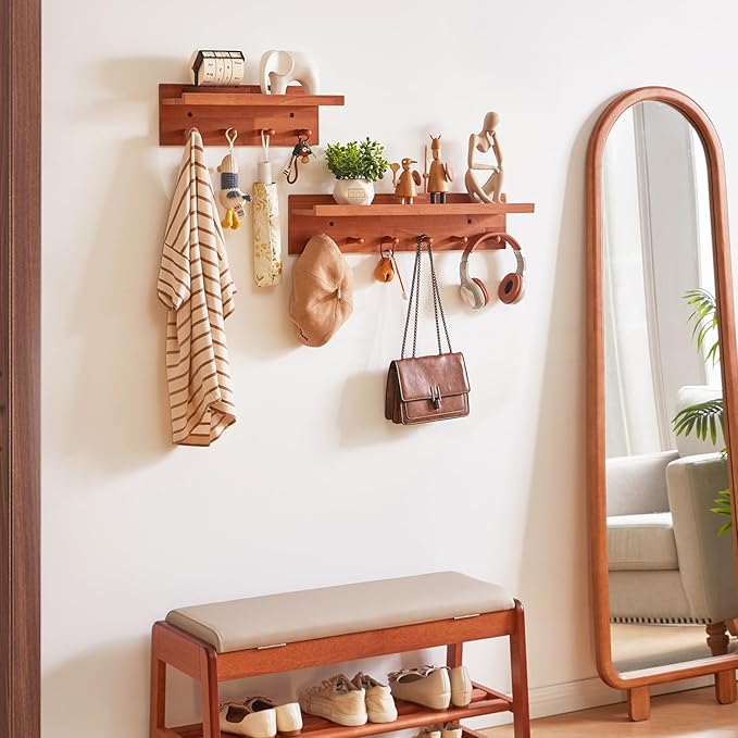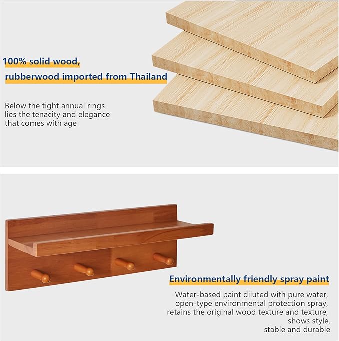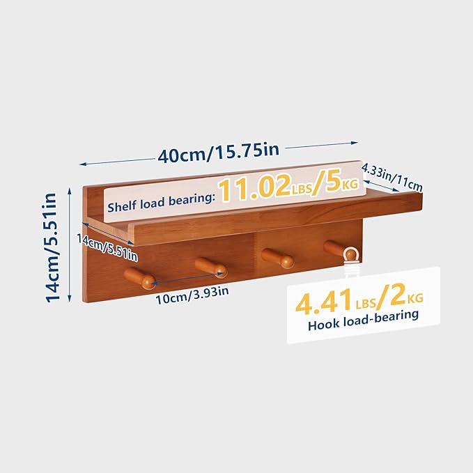 - Premium Solid Wood Construction:Crafted from 100% natural solid wood with smooth eco-friendly coating, this wall hook shelf resists warping and moisture damage. Built to hold up to 11.02lbs for coats, towels, or kitchenware