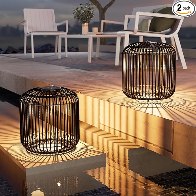- HANDWOVEN DESIGN: Crafted with handwoven natural/black wicker in elegant openwork patterns, this outdoor lantern features a removable jute rope handle for versatile tabletop/ground/ hanging display. The intricate weave blending retro charm with warm glow for romantic decor