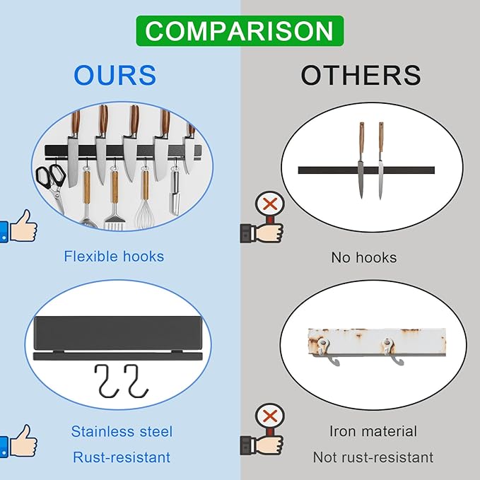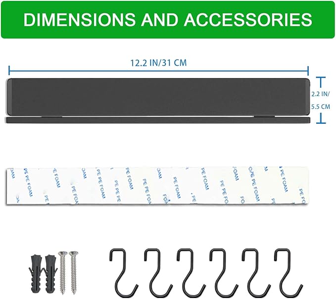 - 【Multifunctional Knife Magnetic Strip for Wall with 6 Hooks】This 12-inch kitchen magnetic knife strip conveniently stores 3-5 knives and includes 6 hooks black for hanging non-magnetic utensils or accessories. Optimize your space, perfect for kitchens, garages, bathrooms, and RV organization and storage.