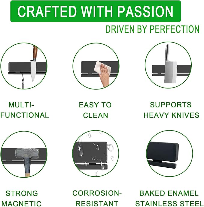 - 【Premium 304 Stainless Steel & Scratch-Resistant Black Finish】Crafted from durable, rust-resistant 304 stainless steel, our magnetic knife holder black maintains its sleek, scratch-resistant surface. Perfect for damp kitchen environments, ensuring long-lasting quality.