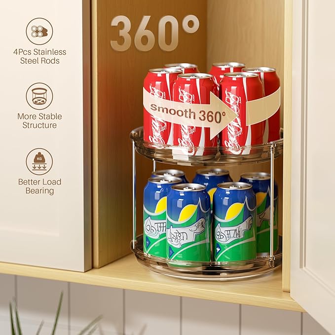 - ENHANCED METAL RODS: Unlike other flimsy plastic spinning seasoning organizers, our lazy susan turntable for cabinet uses metal rods to connect the two tiers for a sturdy construction that ensures stability even when loaded with heavy jars