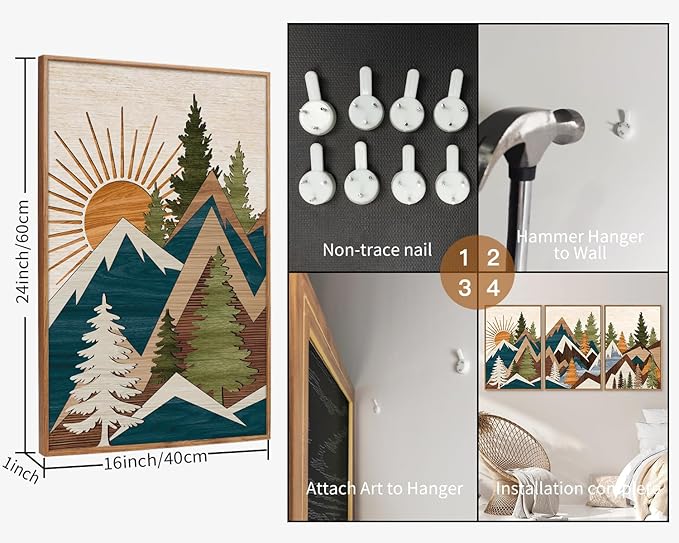 Tinonedraw Large Metal Mountain Framed Canvas Wall Art of 3, Boho Rustic Sunrise Forest Wall Decor, Modern Nature Country Artwork, Vintage Wilderness Art Print for Living Room Bedroom Office 16"x24"