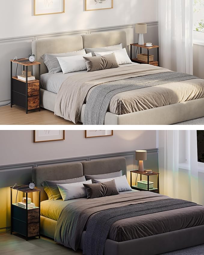 TUTOTAK Small Narrow LED End Table with Charging Station, Side Table Outlets, Nightstand with 2 Cloth Drawers, Couch Table, for Living Room, Bedroom, Bedside, Brown TB01BB085L