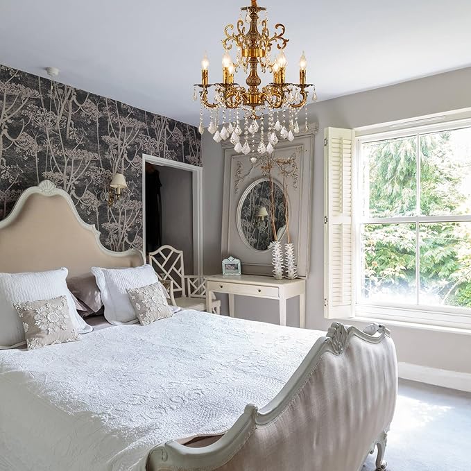 - This 6 Arms Crystal Candle Chandelier is a classic statement piecen with a beautiful antique gold finish, giving it a rich, old-world charm that complements classic, vintage, and even some transitional decors.