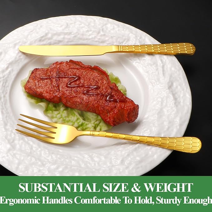 - WONDERFUL WORKMANSHIP AND FUNCTIONAL---Our gold utensils set is made of multiple mirror polishing treatment, silverware set with Water Cube handle design Each piece is beautifully adorned with a delicate Water Cube pattern,edge smooth , elegant and classical appearance, adding to the beautiful experience of everyday dining.