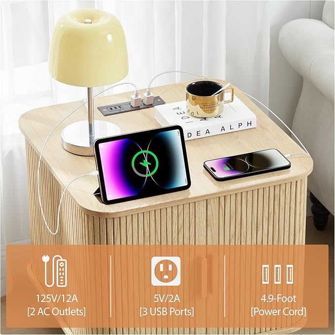 Farmhouse Square End Table with Charging Station, 24" Large Fluted Sofa Side Table with Sliding Tambour Door and Storage, Rustic Curved Wood Nightstand for Living Room, Bedroom, Natural
