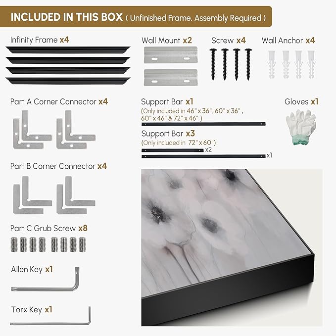 - Assembly Required: The artwork comes with the frame components unassembled. Don’t worry — setup is straightforward and tool-friendly. For best results and accurate alignment, we recommend two people to ensure a smooth assembly and a stable, secure wall mount.