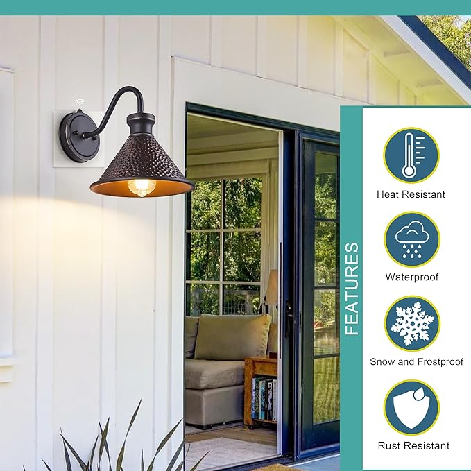 - 【Stylish Dark Skies Design】: This is a very stylish Dark Skies compliant light fixture.Connected to a round backplate by a gooseneck stem, the trendy hammered cast aluminum shade incorporates a modern feel to emphasize a perfect balance of cozy, functional and casual living.The objective of Dark Sky is to preserve and protect the nighttime environment along with our heritage of dark skies through quality outdoor lighting. These products are designed to minimize glare ,reduce light trespass and curb the effects of light pollution.Ideal for farmhouse architectural design styles.