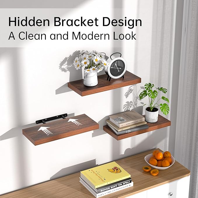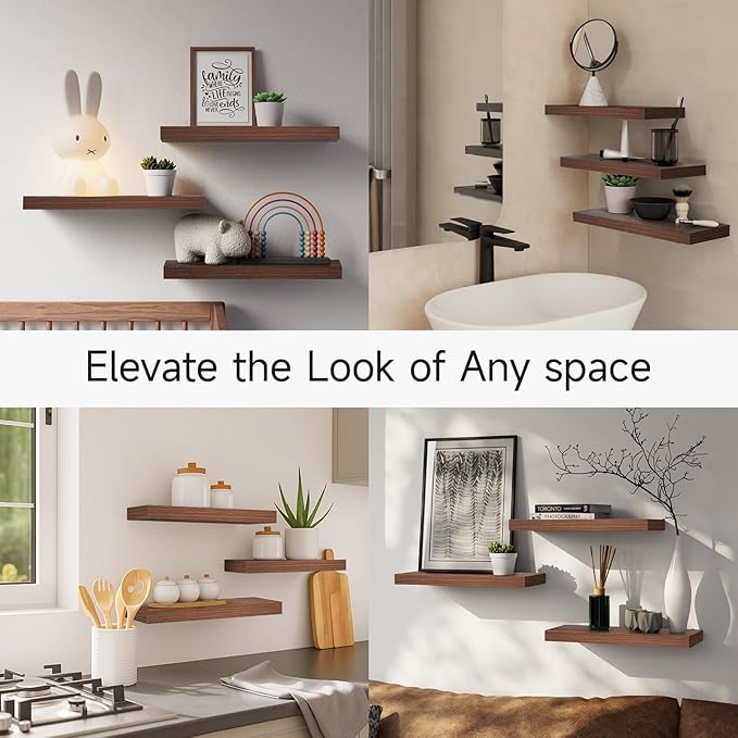 BAYKA Floating Shelves for Wall, Wall Mounted Rustic Wood Shelves for Bathroom, Bedroom, Living Room, Kitchen,Small Hanging Shelf for Books/Storage/Room Decor (Walnut-Like, Set of 3, 15.7in)