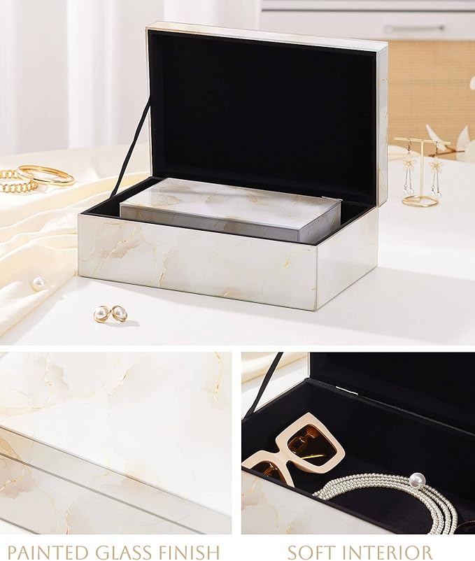- Premium Quality Decorative Box Set: This set includes two beautifully crafted decorative boxes. The outer frames are made of luxury glass material, while the inner linings are soft velvet, ensuring durability and a luxurious feel. The large box measures 11.10×7.44×4.02 inches, and the small one is 8.35×5.08×2.83 inches. Ideal for storage, organization, or as a stylish keepsake, these boxes are a must-have for any home