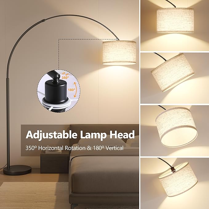 - Rotating Head and 20lbs Solid Metal Base: Customize your lighting direction with flexible dual-axis adjustment—rotate the shade 350° horizontally and tilt 180° vertically to eliminate shadows or highlight decor.Also,you can extend or retract the arched arm by 12.6 inches to position the light precisely over couches, chairs, or beds. Combines wide coverage with focused task lighting.Engineered with a heavy 20-pound weighted base, this standing lamp stays firmly grounded even when fully extended. No wobbling or tipping—just rock-solid stability for homes with kids or pets.