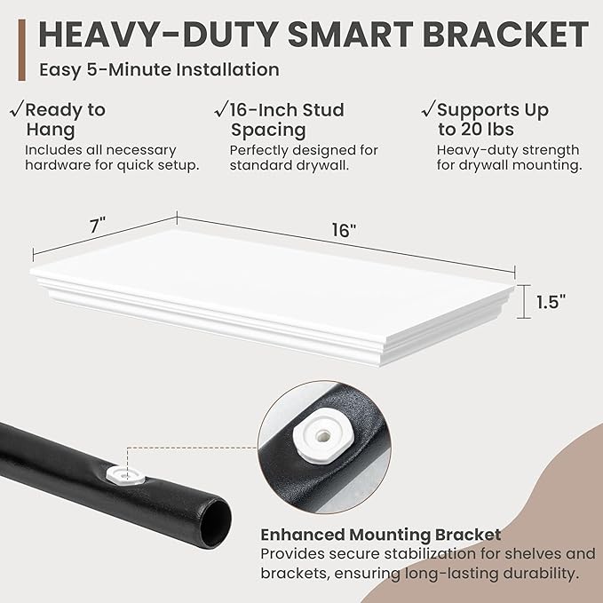 - Strong Suppoot: MDF wooden floating shelf with reinforced brackets supports heavy items effortlessly, holding up to 20 pounds. Hanging shelf's bracket has been preset with a 2Β° elevation to remain level and not sag after bearing heavy loads