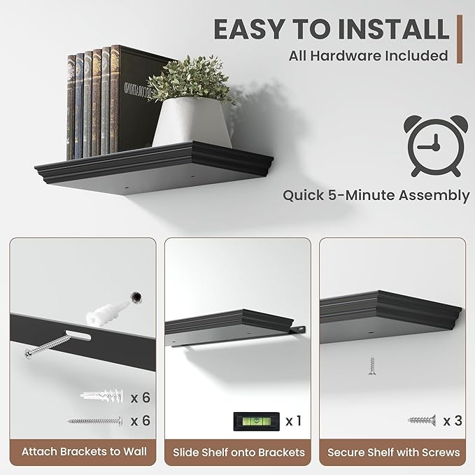 - Multi-Purpose Floating Shelves for Wall: Upgrade any space with these retro, sleek black shelves! Perfect as shelves for the room wall, book shelf for the wall, living Room, office, bedroom, bathroom, or kitchen shelves