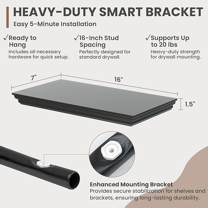- Strong Suppoot: MDF wooden floating shelf with reinforced brackets supports heavy items effortlessly, holding up to 20 pounds. Hanging shelf's bracket has been preset with a 2Β° elevation to remain level and not sag after bearing heavy loads