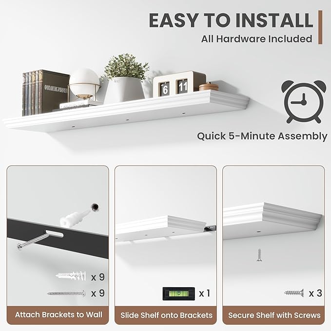 - Package Contents: 1 white floating shelf included, board dimension: 47.3"Wide x 9.3" Deep x 1.5" Height. Other accessories: 1 metal brackets, 1 magnetic level, 3 wood iron connection screws, 9 wall screws and expansion tubes, and 1 installation manual