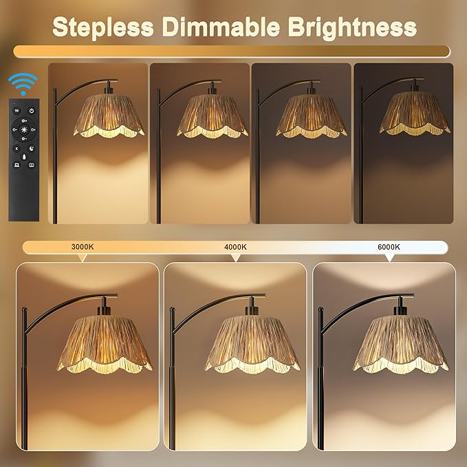 - 【Stepless Dimmable & 3 Color Temperatures】Saving your time to look for compatible bulbs, Our rattan floor lamp comes with an E26 smart bulb, which supports stepless brightness (1%-100%) and 3 color temperatures (3000K-6000K)and timer settings(1hour)as needed, This dimmable floor lamp also have pre-set modes offering various scenes such as: read, nursery, work and night light.The memory function can help you remember the last setting.