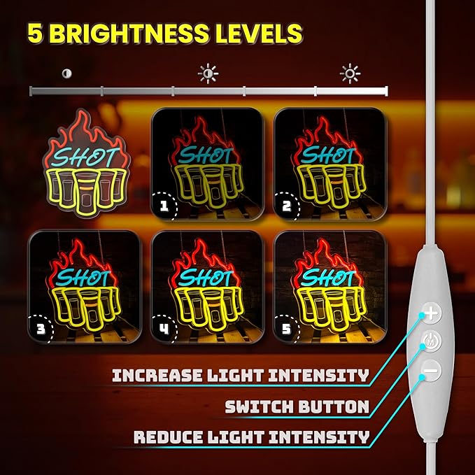 - 【Dimmable】 Liquor neon sign has 3 smart buttons that can adjust the brightness from 10% to 100% to meet your different lighting needs. After you adjust the brightness, turn it off, and when you turn it on again, the neon sign light will still be the brightness you adjusted, without you having to adjust it again.