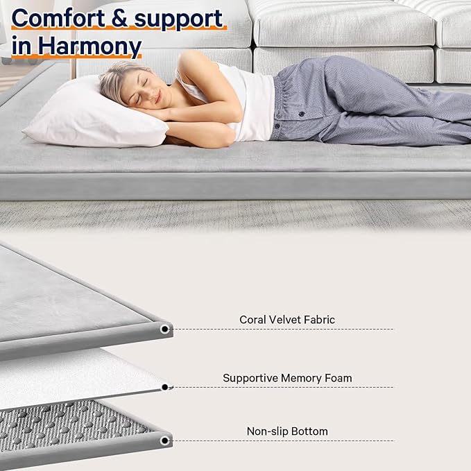 - đŁSAFE & COMFY: Our baby play mat is made of 100% coral velvet material and filled with high-quality 3cm thick memory foam,eco-friendly and durable, providing a safe and comfortable play area for your little ones, without worrying about them hurting themselves on hard floors.The surface of this floor mat is velvet cover, which is not only soft and comfortable to touch, but also has a good cushioning effect.